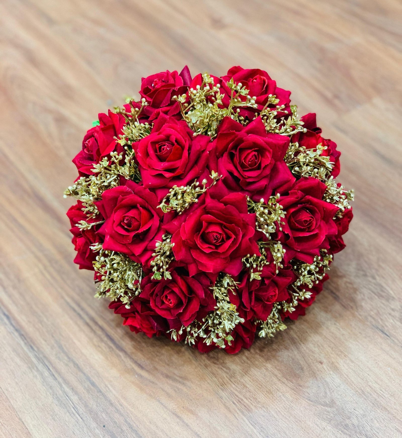Celebrate your most cherished moments with this luxurious, classic rose bouquet. A stunning arrangement of deep crimson red roses is beautifully accentuated with delicate, shimmering gold filler, making it the perfect statement piece for any significant occasion.