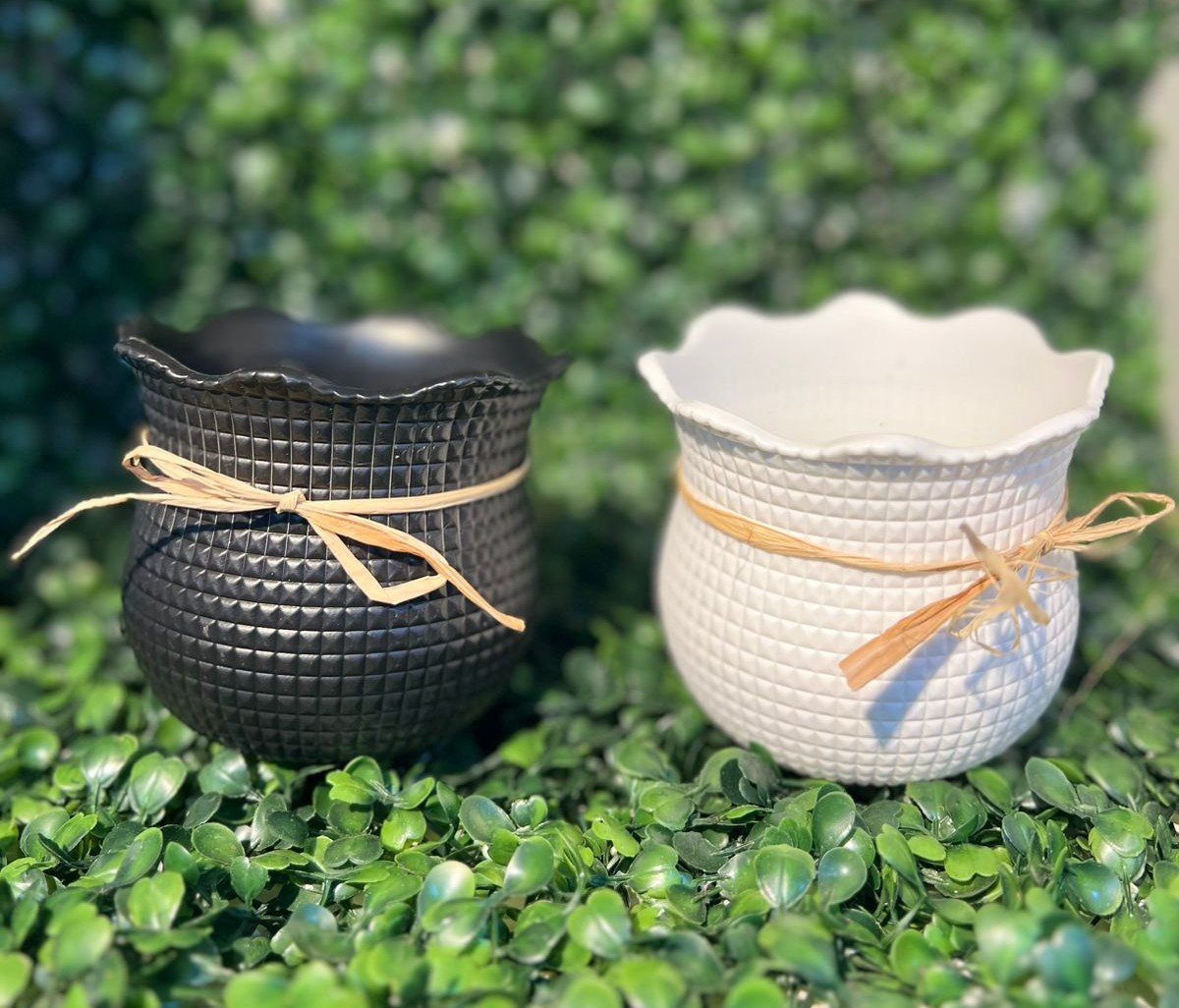 Available in crisp Matte White and dramatic Matte Black, each pot is finished with a rustic raffia tie accent. They are perfectly sized for small succulents, herbs, or votive candles, making them an excellent choice for coordinated decorating.