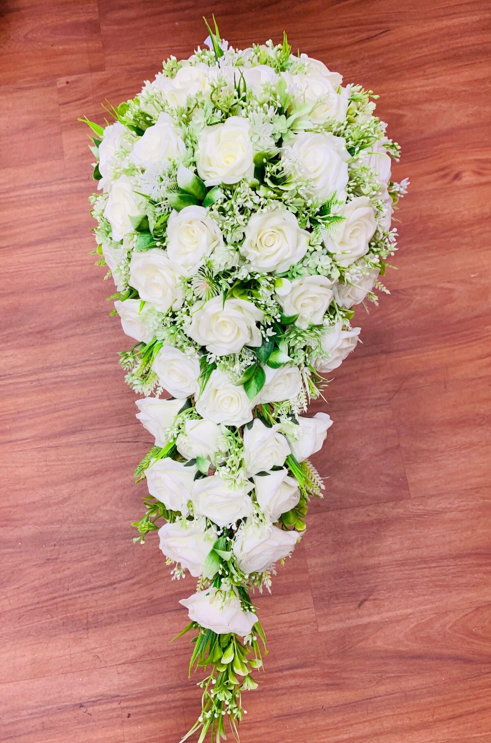 Embrace timeless elegance with this stunning cascading bridal bouquet. Crafted with immaculate white and ivory roses and delicate sprigs of light greenery and filler flowers, this long ‘waterfall’ style is a classic choice for the bride who desires a dramatic, sophisticated silhouette. Its traditional beauty makes it an outstanding choice for a formal wedding ceremony or as an impressive accent piece for a major anniversary celebration.