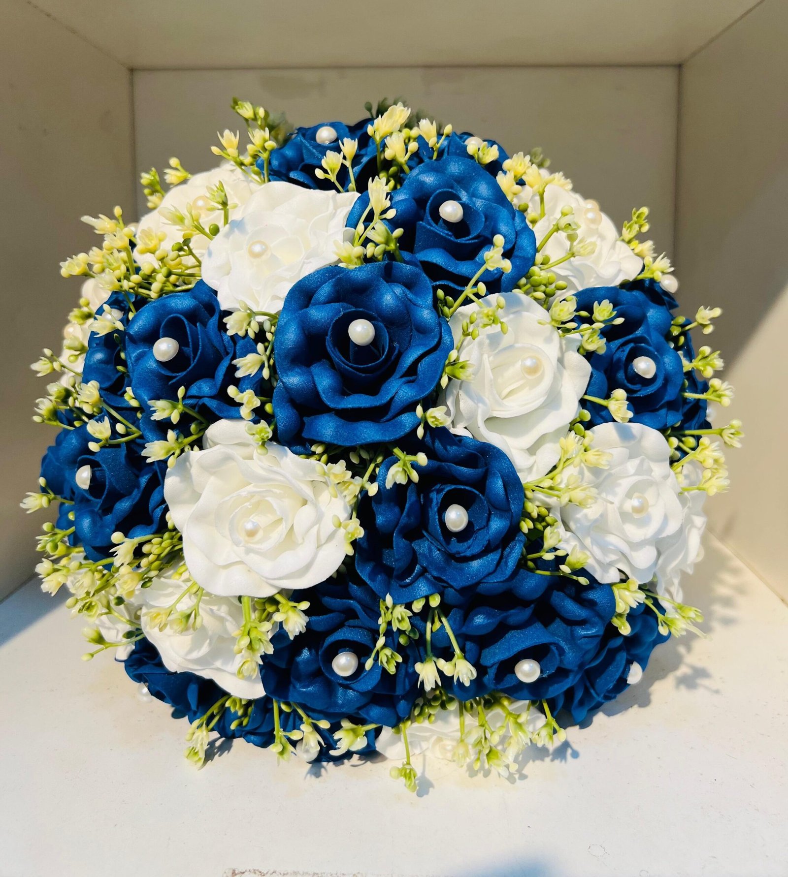 Exude sophistication and classic beauty with this stunning arrangement of deep sapphire blue and pristine white roses. Each rose is adorned with a lustrous pearl, adding a touch of opulent elegance. This timeless color combination is perfect for a formal wedding, a milestone anniversary, or any grand celebration where you want to make a luxurious statement. The delicate white filler flowers enhance the rich tones and intricate details.