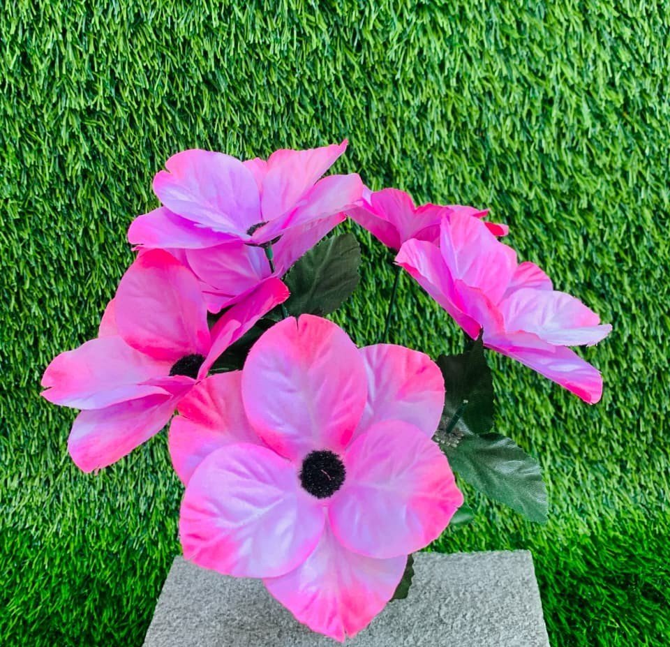 Bring an exotic flair to your decor with this stunning bouquet of tropical-style faux flowers. Each large bloom features a captivating gradient of hot pink and magenta, fading to a softer white at the base, centered with a deep, dramatic black stigma. The lush fabric petals and rich color saturation make this arrangement a striking focal point. Perfect for adding a vibrant touch to a console table, or entryway, these maintenance-free flowers offer the luxurious look of an orchid or hibiscus without any of the fuss.