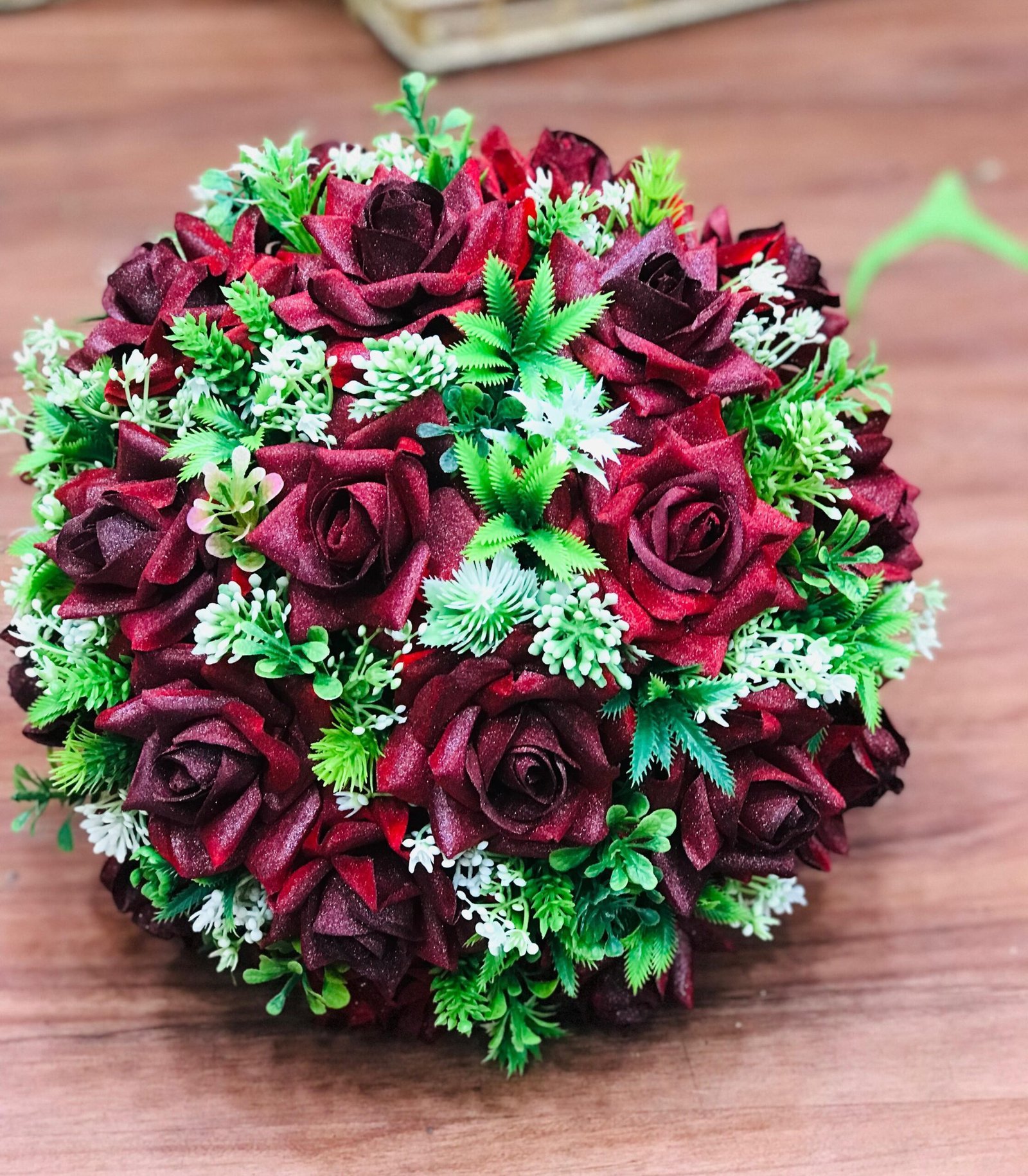 Embrace deep romance with this lush, textured bouquet featuring dark, velvety burgundy-red roses nestled among vibrant, mixed emerald and sage green foliage and delicate white sprigs. This striking contrast creates a rich, sophisticated, and deeply romantic aesthetic.