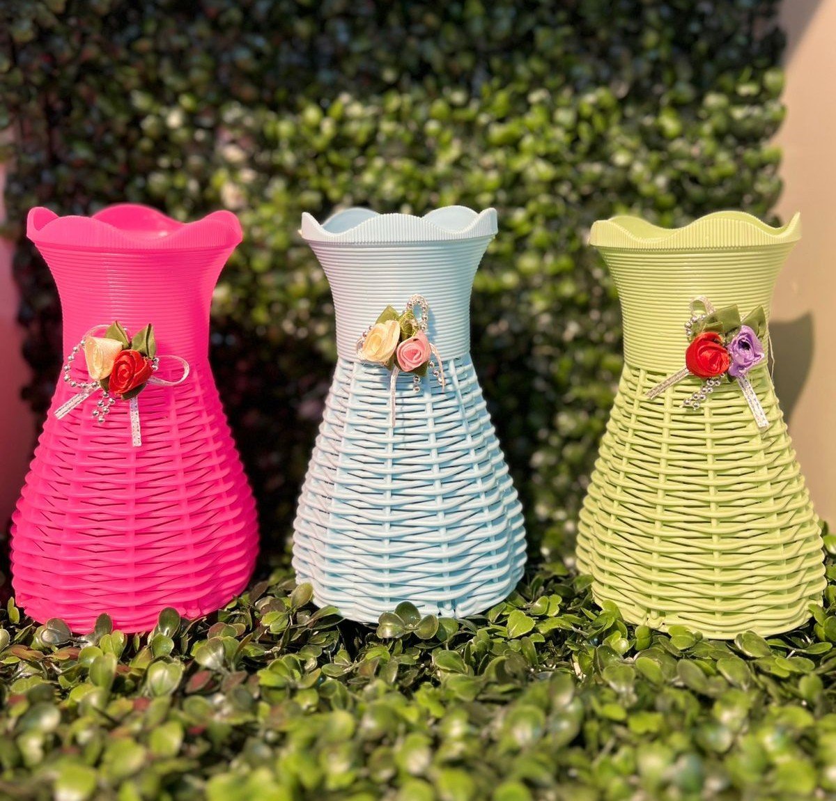 Bring a playful splash of color to your home or next event with these unique, woven-look decorative vases. Crafted from durable material (likely plastic/resin) to mimic the charming texture of traditional basketweave, these pieces feature a distinctive silhouette reminiscent of a flared skirt or dress.